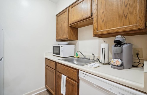 • Full kitchen with refrigerator, stove, microwave, toaster, and Keurig coffeemaker