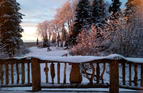 Enjoy a spacious room with a queen bed lower bunk and single upper bunk. Large couch could accommodate a fourth person. Library, direct TV , small fridge, desk. Hilltop B and B with large decks from which to enjoy sweeping views of 17 acres of woods and gardens. Kitchen, living and dining area as well as barbecue on upper deck allows for a relaxing evening cooking your dinner or just relaxing. This place is Alaskan, with log porches and lots of flowers.