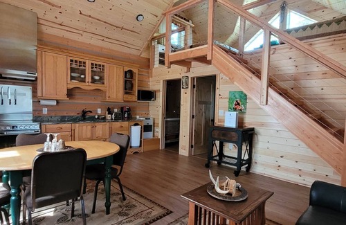 Redfox cabin is the beauty and artistry of an authentic handcrafted home with a high vaulted ceiling, custom dormers, designer round window, granite countertop kitchen, handcrafted staircases, and covered porch. This cabin layout is perfect for your special occasion to celebrate. Redfox is 12 minutes drive outside Denali National Park Entrance, secluded, surrounded by trees, and off the parks highway.