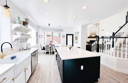 Imagine your inner chef greeted by this magnificent gourmet kitchen. It is decked out with a high-end luxury oven range and hood, an overstated island with seating at the far end and, of course, the brilliant and beautiful center to any adorable kitchen is the farmhouse sink. The kitchen is fully stocked with all the basic dining essentials for your convenience. Please feel free to enjoy the endearing dining nook that looks out into our luscious backyard.