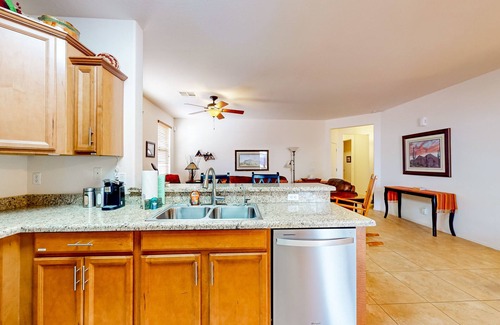 Your dream desert escape comes surrounded by lovely views and shrouded in sunshine. Welcome home! Upon entering, you will immediately take notice of the open-concept living room, dining room, and kitchen. Settle down and enjoy each other's company from the leather seating or from behind the kitchen's granite countertops. As the chef of your group prepares their favorite dishes in the kitchen, show off your musical side with the help of the keyboard and guitar. When it's time to eat, enjoy an alfresco meal on the patio. While you're outside, you'll be able to enjoy the mature desert landscaping, cookouts on the gas grill, and the gorgeous fence mural. Back inside, the interior amenities extend to a private washer/dryer, central air conditioning, and a collection of board games.