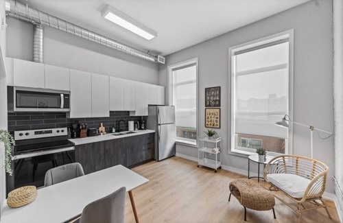 Experience this brand new boutique loft designed with functionality, style, and comfort in mind. This chick designer loft with high ceilings, bay windows, 1 bedroom and a fully equipped kitchen and bathroom is perfect for short and long-term stays.