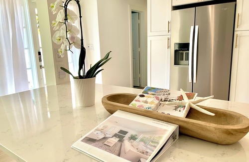 OWNED BY AN INTERIOR DESIGNER, the emphasis is on providing you with the perfect resort style environment for relaxation during your Naples holiday stay at “BLUEBELL”…..comfortable, beautiful and welcoming you for a very special stay in the heart of Old Naples. One step inside and you will know this is not your standard vacation rental home. Old Florida style is thoughtfully preserved on the exterior of this charming home, providing a unique experience for our guests as this style becomes rarer and rarer in Old Naples due to redevelopment. The inside is now transformed and features a modern, open concept floor plan that includes two separate living room/sitting areas, 2 dining spaces, a gourmet kitchen with large island, three large bedrooms and two baths, and screened in heated pool just steps outside the double doors from the laundry/utility area. A sizable rear patio, complete with a dining table for six, four comfortable outdoor club chairs, two umbrellas, and gas grill, overlooks an expansive fenced, rear yard with mature shade trees and palms. Double doors in the den and second king bedroom lead to the backyard and patio and provide tranquil garden views by day and night.