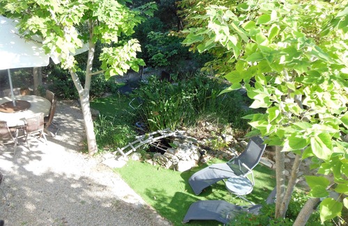 Shady garden with pond and small swimming pool 4 x 2 m.