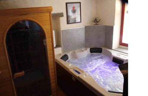 Ground floor: kitchen, living room, lounge (wood stove), shower room, WC, wellness area including a 4-seater jacuzzi and a 2-seater sauna with views of the garden.