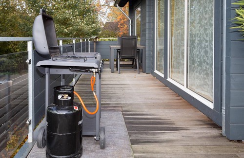 On the 1st floor: (open kitchen(electric kettle, cooker(4 ring stoves, induction), coffee machine(filter, pads), combination microwave, dishwasher, fridge-freezer), Living/diningroom(TV(flatscreen), dining table, seating area, party games, toys), toilet(washbasin, toilet), balcony, heating(floor heating), stair gate, awning)