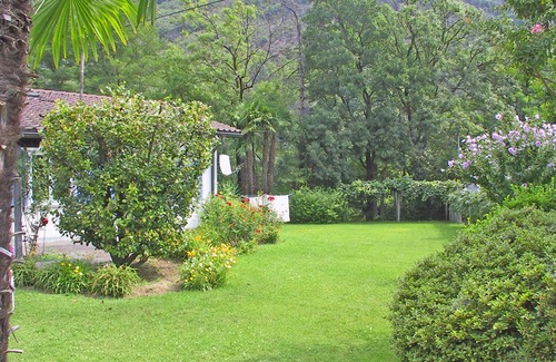 Losone is near place to Ascona and lies ca. 2 km from Locarno. The house was built in 1962 and renovated partially in 2009. The one family house lies on quiet position, village border and near the wood. The river Maggia with bath possibilities, (different types of beaches), large meadow, often with drinks stall and barbeque possibility, just 200 m form the house. The one floor house has mountain view. From the living room exit on covered and furnished terrace. Garden with meadow for private use. Driveway until house. Reserved parking place. Bus stop, store ca 1.3km. Golf place Losone with 18-holes ca. 1.5km. Lake, Ascona ca. 4km. Bed, kitchen linen available. Washing machine/dryer for private use. Pets permitted.