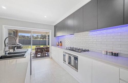 The primary bedroom comes with a king-sized bed, a walk-in wardrobe and an ensuite replete with his-and-her vanities. The second and third bedrooms feature queen-sized beds, while the fourth bedroom has two single beds. All bedrooms have wardrobes for storing your belongings. The main bathroom is kept pristine with a walk-in shower, double sinks and a soaker bathtub where you can unwind after a busy day of exploring Mudgee. There is also a separate powder room with a toilet and hand basin. Your group will enjoy the convenience of in-house laundry with a washing machine and dryer.