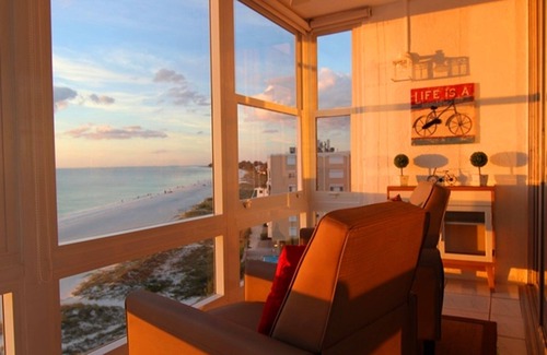 Florida Vacation Dream Spot - easy and fun! This 2 Bedroom, 2 Bath condo is direct beachfront with wide open views up and down the coast. The condo is on the top floor (6th) of the building and is completely furnished with a dining table that seats 6 – 8, sofa and loveseat, coffee and end tables, flat screen tv, and table and chairs on the enclosed balcony that is a perfect spot for watching the beach, ocean, and fantastic sunsets. You can even see dolphins swimming in by! The master bedroom is an enclosed suite with a large walk in closet, private bath, dresser, night stands and king size bed. The second bedroom also has an adjoining bath, queen bed ,closet, dresser, nightstands and two twin beds. The kitchen is fully equipped with quality cabinetry, corian countertops, Stainless fridge, stove microwave and dishwasher. The unit comes with a covered parking space and storage unit equipped with all the beach. Free wifi.