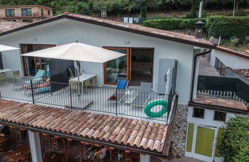 This apartment is one of 4 apartments that we build on the first floor above our restaurant. The apartment is 80 square meters and can comfortably accommodate 5 people. It has a large terrace of 20 square meters equipped with table, chairs, deck chairs and a large parasol; from here you can enjoy a wonderful panoramic view of the lake. The kitchen is equipped with a fridge, dishwasher, induction cooker, oven, microwave, electric coffee maker, kettle and toaster. There is a double bedroom and a bedroom with three single beds. The apartment also has a washing machine, television and Wi-Fi.