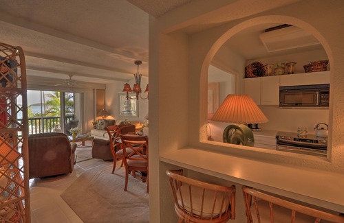 Living room boasts wall of glass doors which opens to screened veranda and has direct unobstructed views of the beach and the ocean. Curl up after a long day on the beach to enjoy watching movies on 52" flat screen DishTV with 252 channels or your favorite streaming channels from the comfortable sofa that seats 2 and the 2 recliners that rock and swivel.