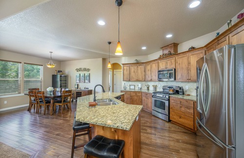 This home is built for entertaining with a spacious open floorplan. The chef's kitchen with gas cooktop opens into a vaulted great room with plenty of comfortable seating. Enjoy your meals and commune at the dining room table which seats six or around the large granite island. The primary suite is set off from the rest of the bedrooms and has a comfortable California King bed, walk-in closet, settee, and television. The ensuite bathroom includes a shower as well as a soaking tub for relaxing. The two guest bedrooms are situated next to the hall bathroom and both have comfortable queen-sized beds along with ample storage space. Adjacent to the front door is an office with a sofa bed for additional sleeping space as needed.