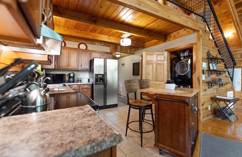 The kitchen is equipped with stainless steel appliances, including a refrigerator with filtered water dispenser and automatic ice-maker, dishwasher and coffee maker among standard kitchen appliances and cookware. A flat screen TV is mounted over an elegant gas fireplace, connected to DISH Network service. Plenty of comfy sofas with room for all. A cozy reading lounge in the open loft sets a peaceful tone for relaxation. Outside, there's a private hot tub behind the cabin, a wrap-around deck with an umbrella table and cushioned chairs, and an electric grill. A fire pit is also available in the yard. Access is easy for 2wd vehicles on paved roads and driveway connecting directly to the front door stairs.