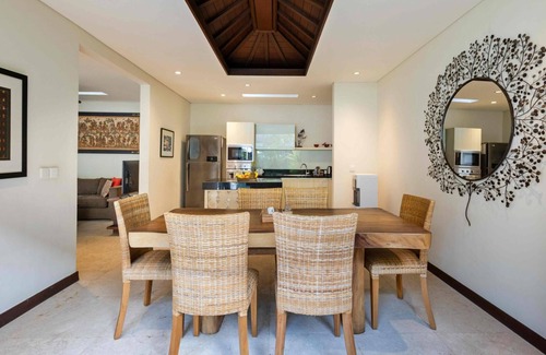 The villa is elegant and fully equipped with modern amenities, such as smart TV, fast internet and pretty Balinese touches. It has three bedrooms, each with its own ensuite bathroom and air conditioning. One bedroom can be made up into twin beds. The master bedroom also has a bath, which is handy if you have kids.