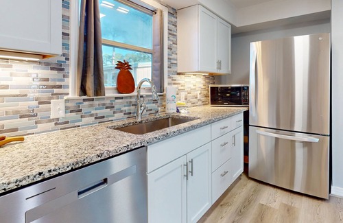 As you enter this bayfront stunner, you will be welcomed by a bright and airy open floor plan that seamlessly combines the living room, dining area, and a convenient wet bar. Spread out comfortably on the sofas and stream fun movies, shows, and even sports games on the smart TV with streaming and cable services. The wet bar is equipped with a free-standing icemaker and a sink. The adjacent kitchen boasts all stainless steel appliances that will make cooking a breeze. Stock up on groceries and prepare exquisite homemade meals and treats for the crew. Enjoy an extensive wrap-around deck with seating and a gas grill overlooking the bay - the perfect setting for barbecues and taking in beautiful sunsets. Additional perks include an on-site washer/dryer and a fold-out frame with a queen-size air mattress.