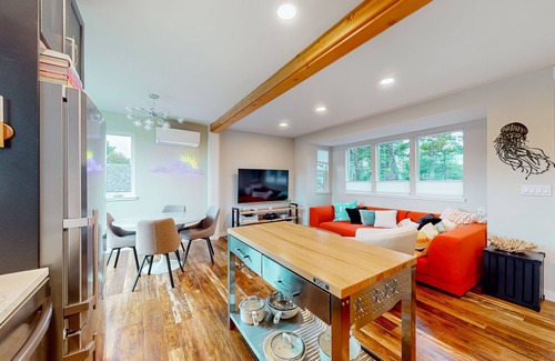After a gorgeous day at the Cape Kiwanda beach, the home of the other haystack rock, return to Shipwreck to barbeque on the deck, swap stories around the firepit, and relax amidst its cool, contemporary decor. The home features a chic, well-appointed kitchen with stainless steel appliances, a versatile dining table suitable for board games or puzzles, and TVs in both the living room and primary bedroom. The home is equipped with WiFi and Hulu Live streaming for guests to enjoy, and both TVs allow guests to log in to their own streaming platforms, such as Netflix.
