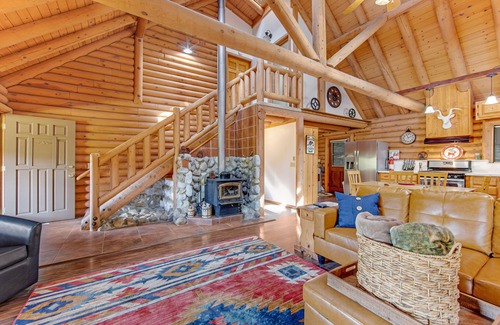 Enjoy a fun vacation in a cabin perfect for families and groups - and their dogs! Enjoy views of the mountains as you take in the true log style construction. An expansive deck and a wood stove indoors means that there's plenty of spaces to chat and play games together. Watch deer eat from the field just beyond! The work station in the second ground floor bedroom is perfect for if you still have some remote work to finish up before exploring. But the most outdoorsy of the group may love the loft bedroom best, which is set up with its own full bathroom nearby and a lovely view of the home's vaulted ceilings on the landing. Once you're back from a walk or a climb, the dusty clothes can go straight into the private washer/dryer. Load up some wood into the wood stove, cook up some snacks in the full kitchen, and settle in to stream some Netflix. It's easy to relax in a cabin!