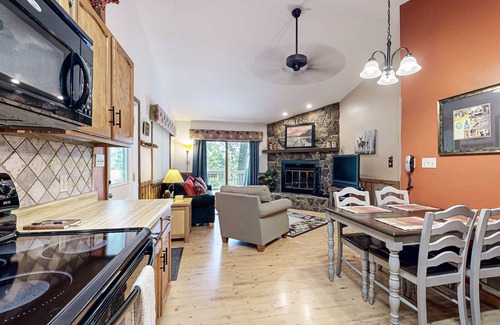 This dog-friendly cabin is equipped with all the amenities you need for a comfortable stay, including a king bed, twin bed, washer/dryer, and a fully stocked kitchen that opens to the spacious living room. Enjoy entertainment options such as cable TV, Netflix streaming, and board games, or simply take in the mountain view from the comfort of the patio or hot tub.