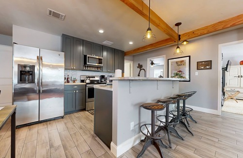 When you need a break from the sun, relax in the roomy living space that hosts rich leather sofas and fun pops of color. Cooks will enjoy preparing family meals in the well-established kitchen with bar seating. When mealtime rolls around, enjoy gathering for meals in the dining space that overlooks hill country views. The cottage's bedrooms are equally comfortable and kept cool thanks to the home's air-conditioning. Additional perks found within include a private washer/dryer and internet access.