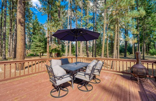 Greet each morning outside on your expansive deck, the perfect place to watch for birds, deer, even the occasional bear or mountain lion moving among the pines. The rest of the single-story interior enjoys the same view, thanks to plentiful windows and large rooms designed for gathering. Enjoy a spacious kitchen with stainless steel appliances, multiple dining areas (including a formal dining room), and a living room where you can stream movies after dinner (using your own accounts). Adding to the home's many comforts are central air conditioning and heating, a private washer/dryer, and high-speed WiFi.