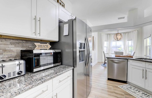 KITCHEN: Dishwasher, fridge, oven, 4-burner stovetop, microwave, breakfast bar w/ seating, drip coffee maker, blender, toaster, cooking basics, dishware & flatware
