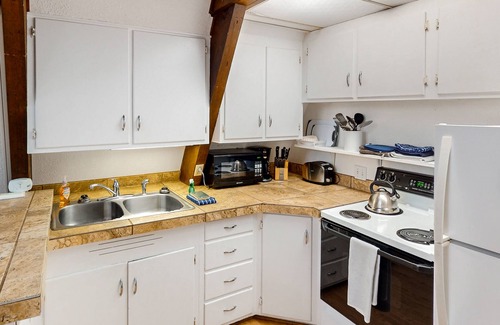With two bedrooms (plus a loft) and two bathrooms, this home can easily accommodate six guests, and you're also welcome to bring your dogs with you, though please note that a small nightly fee applies. The main level of this home, the middle floor, features enormous windows that allow views of the lake, as well as a cozy sitting room and a full kitchen and dining area. Around the home you will have entertainment options including a TV with a selection of VHS movies to watch, board games, and even a game room downstairs with a foosball table.