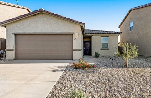 There's room for the whole family (dog included) to unwind at this home tucked in the desert. Outfitted with stainless steel appliances, the well-equipped kitchen features everything you need to prepare favorite recipes. Gather together at the dining table to enjoy home-cooked meals. The kitchen bar provides a convenient perch for morning coffee and post-dinner drinks. End your days with a movie night on the smart TV in the living area. Additional perks of this home include a washer/dryer and central AC.