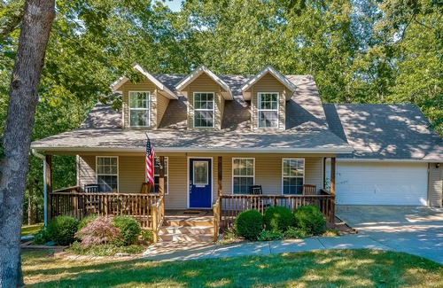 Dog-friendly home with wooded views, fireplace, W/D & classic front porch | House in Bella Vista