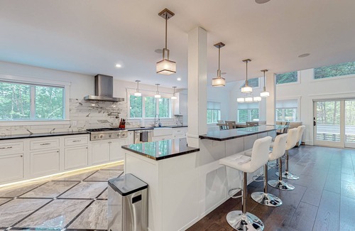 Inside this bright and sunlit, two-story retreat, you'll find an expansive great room with a vaulted ceiling and loads of windows welcoming in lush, forest views. Visiting chefs will celebrate all that's offered in the exquisite, high-end kitchen complete with stainless steel Thermador appliances, a breakfast bar, and loads of countertop prep space. Dine indoors at the adjacent table, or head out to the deck, fire up the gas grill, and indulge in an alfresco experience in the open air. Back inside, switch on the gas fireplace, settle into the large sectional, and stream your favorite channels on the smart TV in the living area.