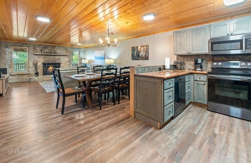 As you walk into the open-concept living room and kitchen, you'll be greeted by the warmth of the stone wood-burning fireplace at the heart of this cozy space. The comfortable leather couch and loveseat invite you to sit down and relax after a long day of exploring the area. On the TV stand shelves, you'll find several games and activities perfect for family time. The flat-screen smart TV is waiting for you to enjoy your favorite shows or movies. The living room seamlessly blends into the kitchen, fully equipped with everything you need to prepare delicious meals for your family and friends. The open-concept design allows for easy communication and interaction between the two spaces, making it the perfect spot for quality time together.