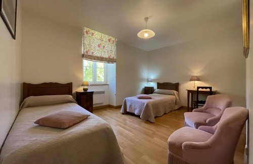 In a beautiful 19th century mansion, this elegant and refined cottage has been tastefully renovated. You are on a farm (ducks) with 4 guest rooms. Farm products for sale on site (foie gras, pâté, rillettes, stuffed neck, confits). Shared fenced swimming pool 12x5m. Unheated. Salt treatment. Ground floor: Kitchenette (microwave, washer-dryer, dishwasher, oven, 4 induction hobs, fridge-freezer). Living room, lounge area (TV, fireplace/insert, WIFI connection). No WC on the ground floor. Upstairs: 3 bedrooms (1 double bed, 1 double bed, 2 single beds), 1 bathroom (2 sinks, 1 bathtub). 2 separate WCs. Beds made for your arrival. Towels for hire on request. Baby bed. WIFI internet connection. Electric heating included (heat pump on ground floor, convectors upstairs) and wood provided. Parking on the property. Lovely unfenced park of 5000 m² shared, private enclosed garden for the gîte, garden furniture, barbecue. We accept your pet with a small supplement of 3 euros/day. Near a wood (marked paths) and the Gave d'Oloron (trout and salmon fishing).