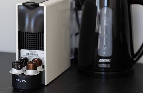 Fridge with freezer, electric hob, oven, microwave, dishwasher, electric kettle, capsule coffee maker, dishes, cutlery, pots, pans, wine glasses.