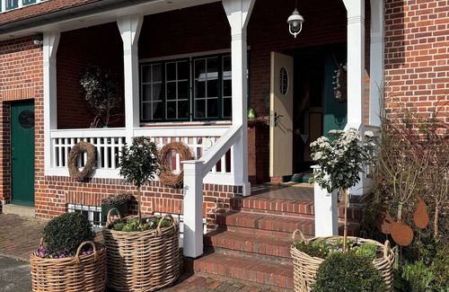 We offer you apartments in our beautiful old country farmhouse. The house was designed in 1908 by two architects from Bremen, after the old farmhouse burned down. The new building should suit the region, but also have a few special features. At that time, a veranda with main entrance on the side was chosen and behind it a spacious lobby with a gallery. The so-called bridal door in the gable is just a gem and was never walkable. Since 1756 the family ran the farm. At the moment it is the 9th. Generation in person by Ulrich Beckmann with his wife Esther and their three children Lasse, Jannis and Bosse. The apartments and rooms are managed by the former divisors Gerd and Annegret Beckmann. Other activities such as coffee tables, farm tours, fruit farm and Boßeln complete their offer.