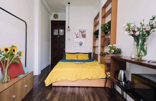 A homestay with 5 well decorated private rooms , this is one of the rooms ,fits 2 pax with a private toilet and a small kitchen corner inside as well as the balcony , the space is about 25 sq meters. Located in district 3, in a quite alley, 5 minutes riding to the city center.Convenience stores, super markets, landmarks like pagodas, churches , ancient traditional markets , drugs stores, restaurants are in walking distance.