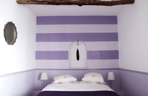 Around a bright patio gently tinged with lilac articulate ten rooms and suites with terraces installed on three levels and a very cozy reading lounge with fireplace and dining room on the ground floor.