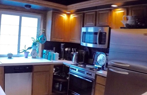 The apartment has tranquil energy, with plenty of space to entertain and relax. It has a dining area off the kitchen on the second floor and also a living area. Upstairs you have your entertainment space with 50 inch TV and comfortable lazy boy coach and lazy boy chair. A gas fireplace on the third floor makes this space a cozy urban Oasis.