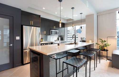 Cook and entertain in the fully equipped gourmet kitchen, complete with modern appliances and a NYC-inspired kitchen island, ideal for memorable meals and gatherings.