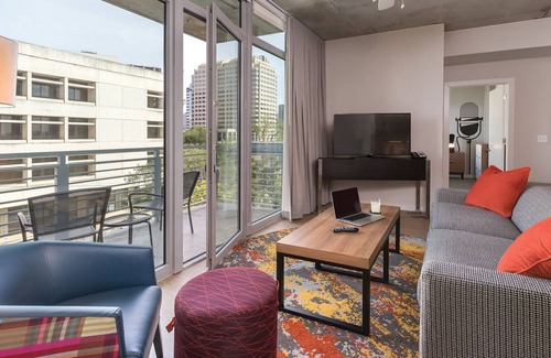 But before you step out to enjoy all that Austin has to offer, take some time to embrace the resort's countless amenities. Relax, cool off and take a dip in the outdoor zero-edge infinity pool and kick back on the rooftop sun deck. Keep up with your workouts at the fitness center, equipped with cardio machines. Guests will enjoy the high-speed Wi-Fi access, a game room and beautiful barbecue areas. Stay in your own personal resort suite right in the heart of Austin.