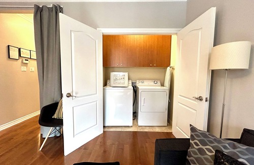 This charming condo has been legally welcoming guests since 2012. Its success lies in its comfort, cleanliness, central location and level of service provided. It has everything you want from an urban pied a terre: a large, very quiet bedroom with a walk in closet and a TV, a cozy living room (that can be closed off and turned into a second bedroom) with a large TV, a fully equipped kitchen with everything you need to cook yourself almost any kind of meal, with an espresso machine and a dishwasher, a lunch counter, a dining room for more formal meals, a laundry area, and a furnished, private rooftop terrasse where you can unwind.
