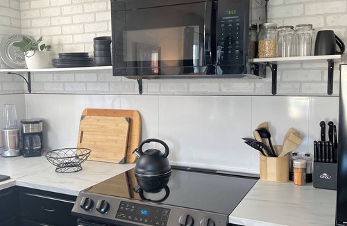 Unique and chic downtown flat with all brand new appliances, flooring, bathroom fixtures, smart TV, and fireplace. Bold style separates this handsome space from the rest. Featuring an all black kitchen with white brick and marble textures, genuine leather sofa, black and marble fireplace, black and gold accents, and classic sports décor throughout. Large master with en-suite full bath and huge walk-in closet. Fully equipped and ready to accommodate business and leisure travelers looking for 30 day+ rental.
