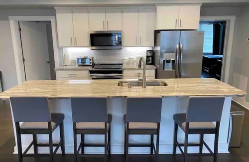 Large king size master bedroom with an en-suite included. Master bath has a double sink vanity, large shower, and 67" soaking tub. Two additional bedrooms, one with a queen bed, and another with two twin XL beds. The second full bath, with two separate sinks, has a dividing door separating each sink for additional privacy. The kitchen, dining and living rooms are shared by an open floor plan. Kick back and relax on large sectional while watching netflix, youtube, hulu, etc. on the 65" smart TV. An additional smart tv can be rolled into the bedroom of your choice. The sectional sofa converts into a pull out double bed with upgraded gel mattress. You'll find many board games and DVD's for entertainment. The kitchen is fully equipped with new stainless steel appliances and 11 foot granite island. Dining table seats 8 comfortably. At basically a home away from home, you'll be comfortable and happy staying in this wonderful 1,650 square ft. West Jefferson retreat.