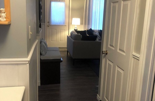 As you enter the house from the back door the laundry room is there , washer, dryer, ironing board , iron and Nellie's laundry soda but feel free to bring your own detergent and dryer sheets .There is no door on the room and the washer can be noisy.
