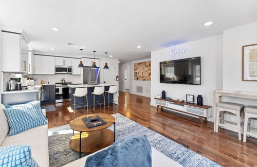 The Dream Unit is an amazing New Construction House that features two levels of luxurious amenities. The main level features Living and dining combo with 3 spacious Bedrooms, 2 full bathrooms, Queen sized sofa bed. The lower level is purposely designed to entertain with an 85” smart TV w/ surround sound bar and full living room set up with a queen size pull out mattress with memory foam cushioning built into the couch. The lower level also features a Foosball table, Air hockey table, and Classic arcade game featuring titles such as Ms. Pacman and Galaga. There are also classic board games for group play and a complimentary snack bar featuring beverage center, a full size popcorn maker and plenty of other potato chips and cookies. A full size laundry room with a Samsung washer and dryer complements the lower level plus a powder room for the guest. There is also a full size fitness gym on the lower level featuring a “Smith Machine” workout station with pulleys for additional exercises and Big Box Gym quality Treadmill and Stationary Bike with Dumbbells, Bosu ball and yoga mat. Adjacent to the gym is an oversized 1 car garage with metallic epoxy flooring. The lower level also leads to our outdoor living space in the backyard. We have a Blackstone grilling station next to our extra large Floating deck with covered gazebo and with a fold down 65 inch TV for your viewing enjoyment. Last but not least, we have a “HOT TUB” section that has enough seating to accommodate 4 guests for a truly spa like experience. No Smoking inside the unit, only at designated area in Back yard by smoking post.