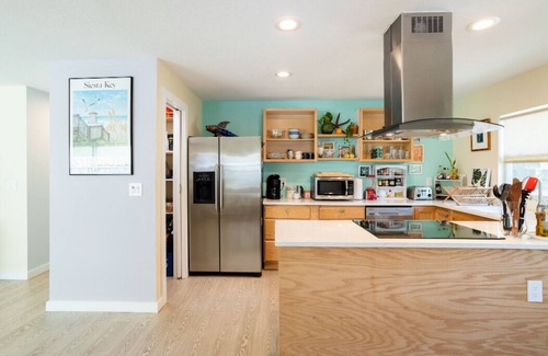 Right in the Rosemary District/Gillespie Park, this bright and spacious private home is a 10 minute drive to Lido Beaches and within walking distance to downtown shops, grocery, farmer's market, opera house, restaurants, bars, live music, tennis courts, parks, antique shops and performing arts centers. Old Florida bungalow on the outside, inside it's a recent remodel with new appliances, kitchen, bathrooms, flooring and fixtures. A banyan tree behind the home offers private, shady repose on the fenced-in deck where you can enjoy the grill and dining area.