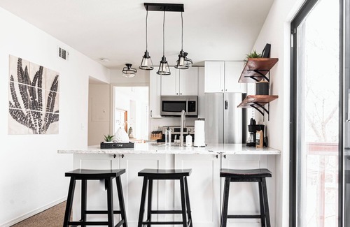 Upon entry into the space, you'll be greeted with a large, open space. You'll find a comfortable sofa, cozy fireplace and big screen tv. Kick up your feet and enjoy the fire with a glass of wine or hot cup of tea after a long day exploring or working. This space has dining for 4 and boasts the open kitchen for easy entertaining or gathering. Head into the kitchen and find a well stocked kitchen. The bedroom offers a luxury queen mattress, comfortable linens for a good nights sleep, as we value comfortable mattresses and linens. The bedroom is also where you'll find the office work space, comfortable enough for remote working needs. The bathroom has a tub and shower combo and there is private laundry in the unit. The sliding door and vaulted ceilings let in plenty of light and fresh air, and gives the space an airy feel. Come spend time in this Modern One Bedroom Unit and enjoy all Colorado has to offer.