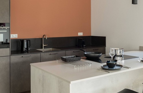 The spacious lounge has a seating area with a smart TV with streaming capacity. The modern, open-plan kitchen has a cooking island and luxury appliances, including a Bora hob, combi-oven, dishwasher, Nespresso machine and wine cooler.