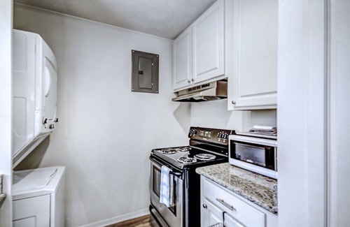 Mid-century modern meets an updated 21st century aesthetic. One queen bed, one bath features recessed lighting as well as granite countertops in both the full kitchen and bathroom. Two closets! The fully equipped kitchen includes stainless steel appliances. Stackable washer and dryer. Bathroom features spacious sink area and subway tile tub/shower surround. Quiet, gated community with plenty of parking - one designated parking space and street parking. There is outdoor seating area in the back.
