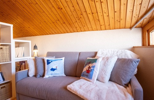 With its 32m² duplex, including the bedroom upstairs, this welcoming space can accommodate up to 6 people. Enjoy soothing views over the courtyard and the majestic surrounding mountains, creating a relaxing setting.
