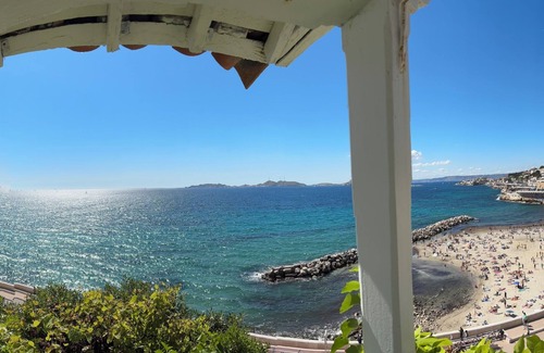 Sea-view duplex, south wing of a waterfront house on "Plage du Prophète", unique panorama. Beach below, access to old port (city center) and calanques on foot or by bike; bus stop below the house; restaurants and shops nearby.