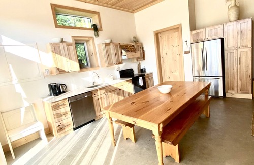 On the second level, you’ll find stunning cathedral pine ceilings with an open concept, bachelor style layout. Up here is an entire space of its own. Amazing king bed and comfy single bed, separated by a half wall and large armoire to create privacy. The bedrooms are comfortably situated in this open concept layout along with a cozy, spacious and stylish (2nd) living room and fully stocked (2nd) kitchen with gas stove. A very large dining table as well as a smaller round breakfast table. The (2nd) full bathroom is inviting with its large soaker tub and high ceilings.